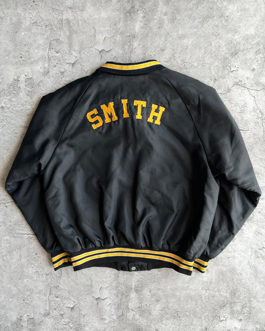 1970S BLACK 'PIRATES' RAGLAN VARSITY JACKET (L)