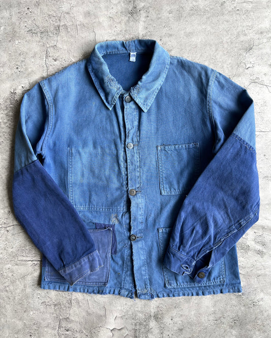 1950S FADED ROUND COLLAR REPAIRED FRENCH WORK CHORE JACKET (M/L)