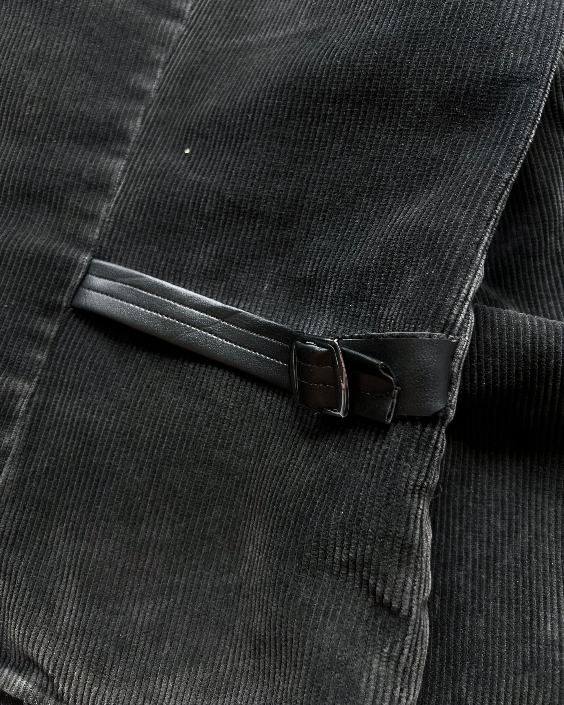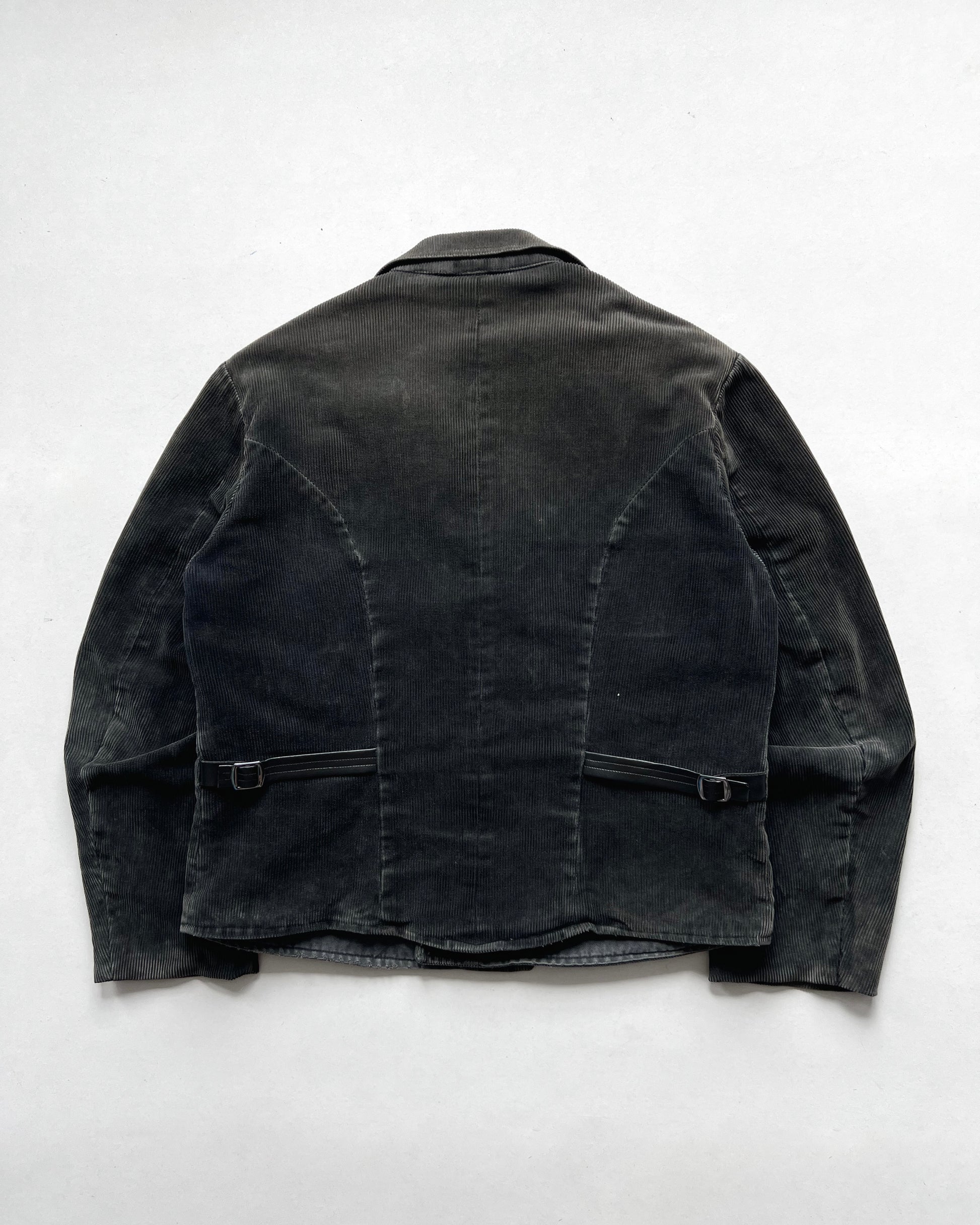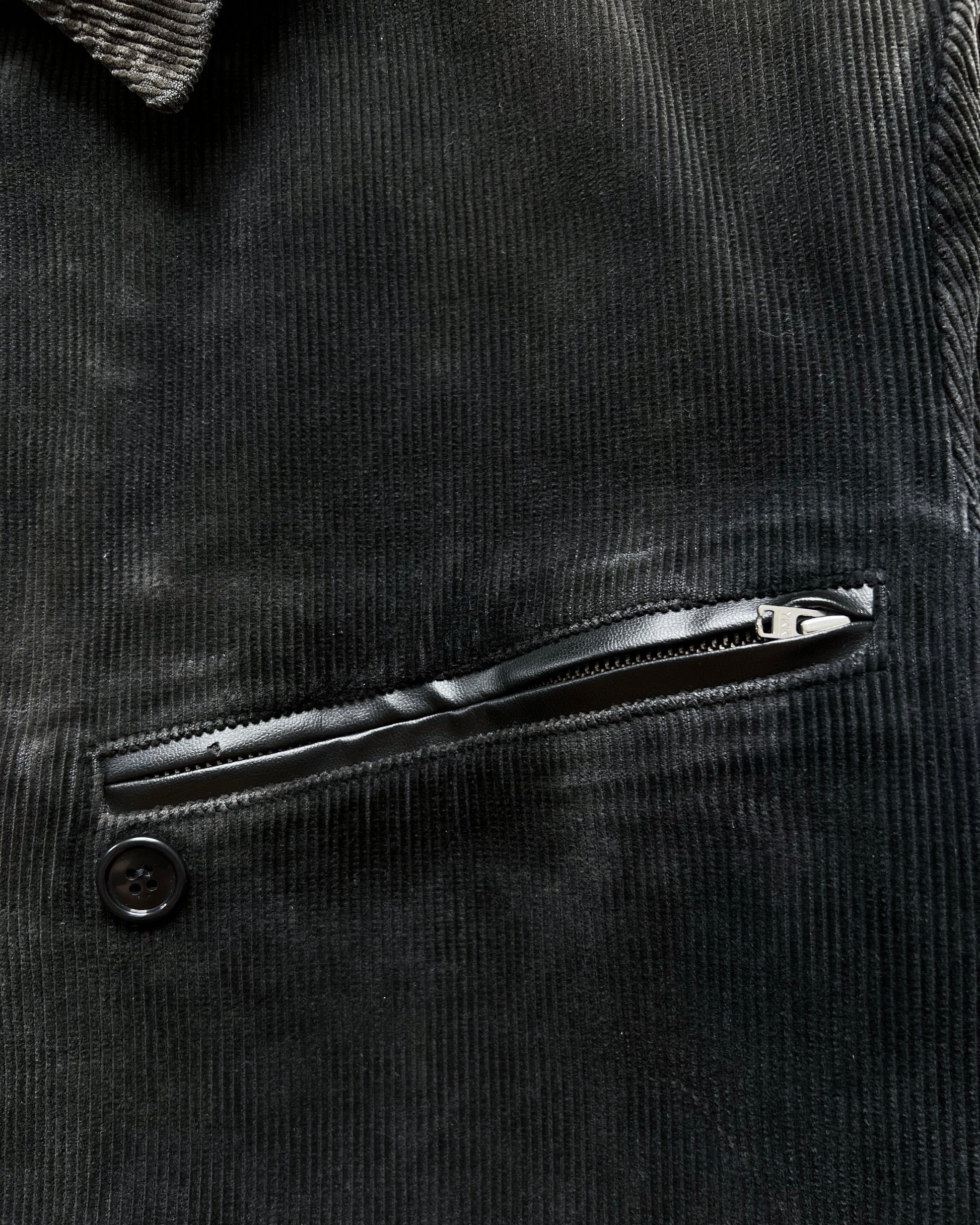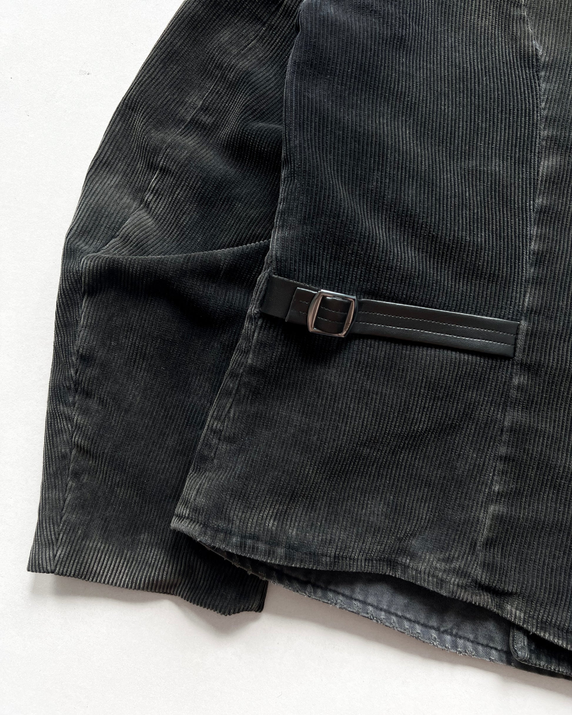 BEAUTIFUL CORDUROY MATERIAL, FADED BLACK WITH HONEYCOMB EFFECTS AT SLEEVES.