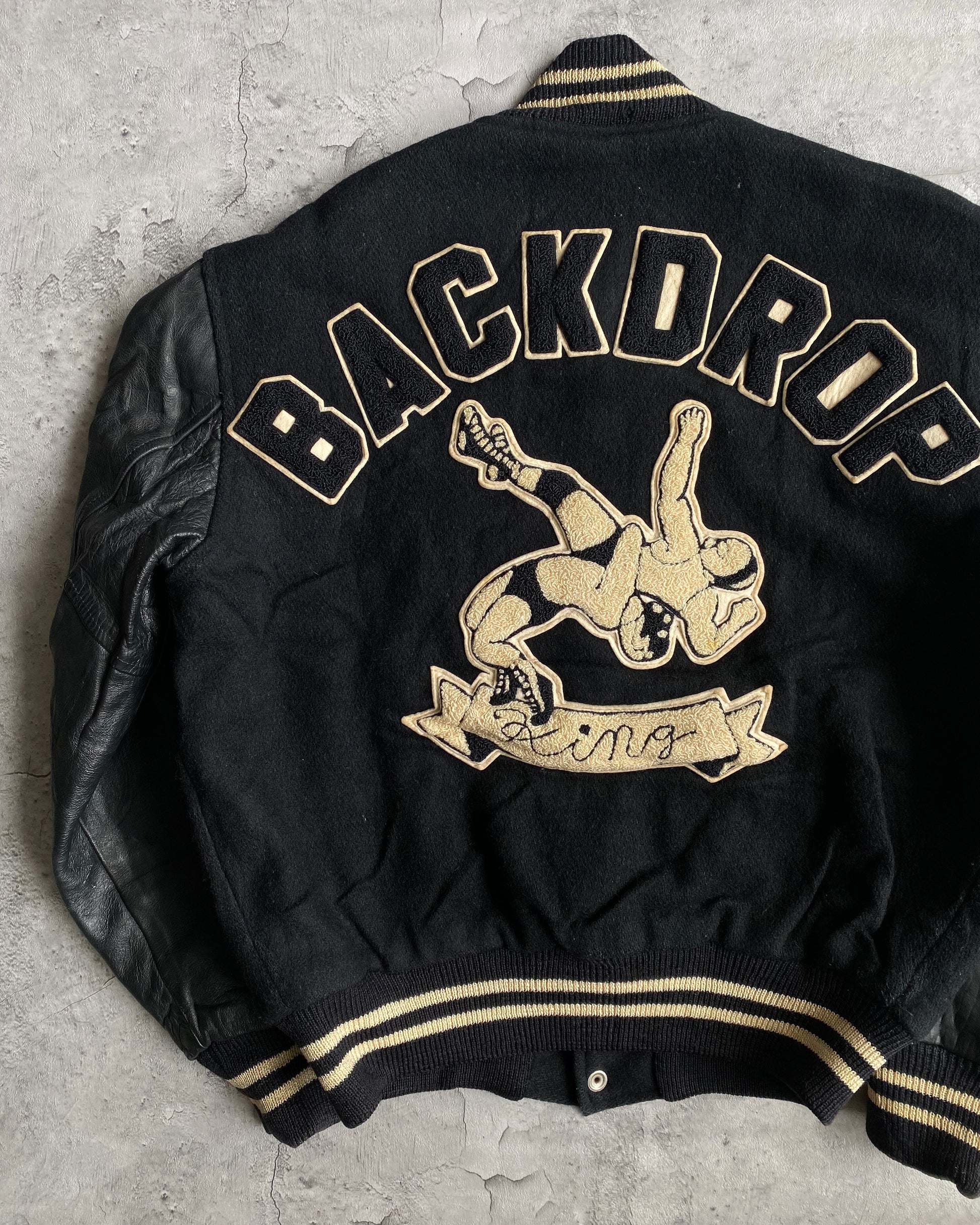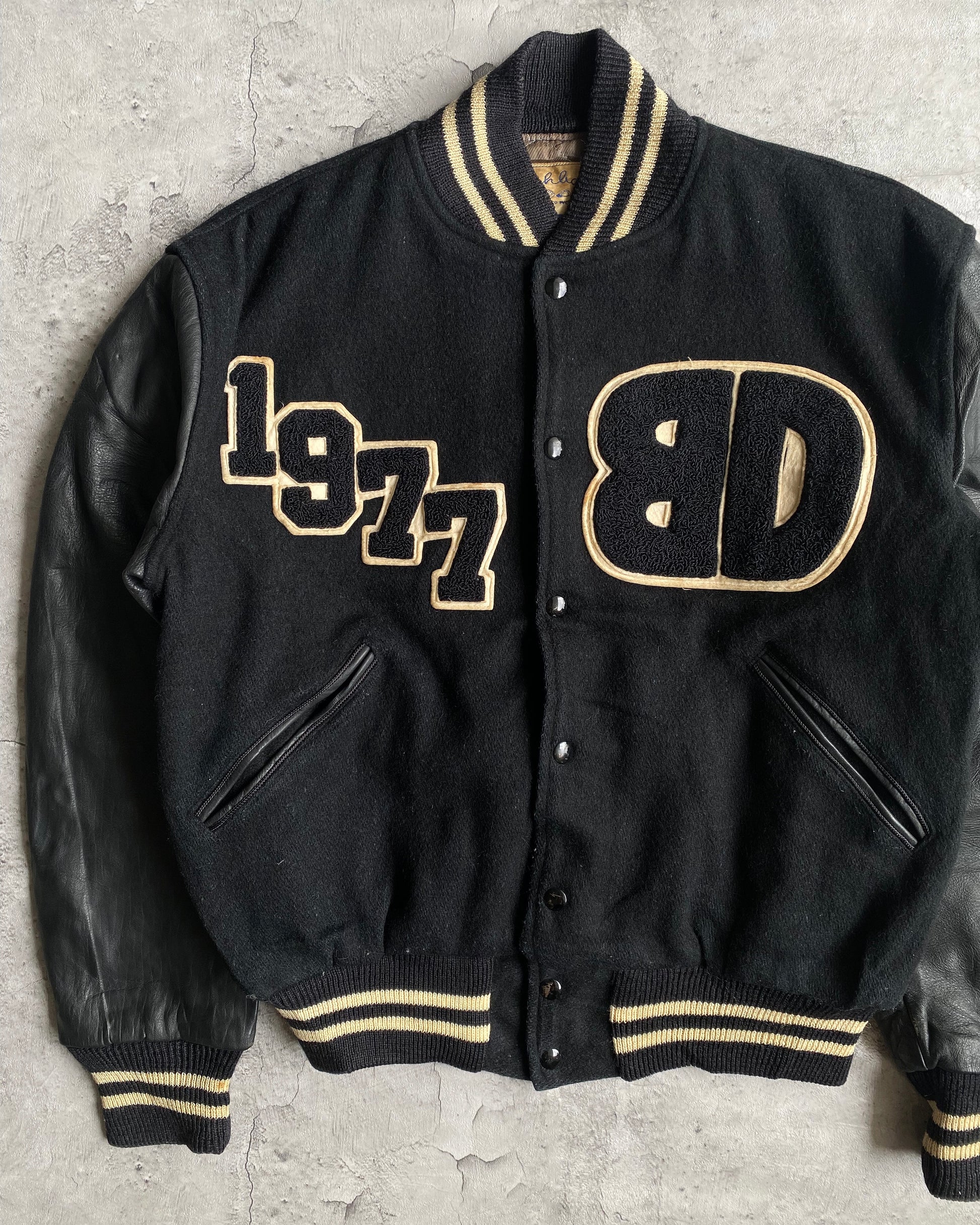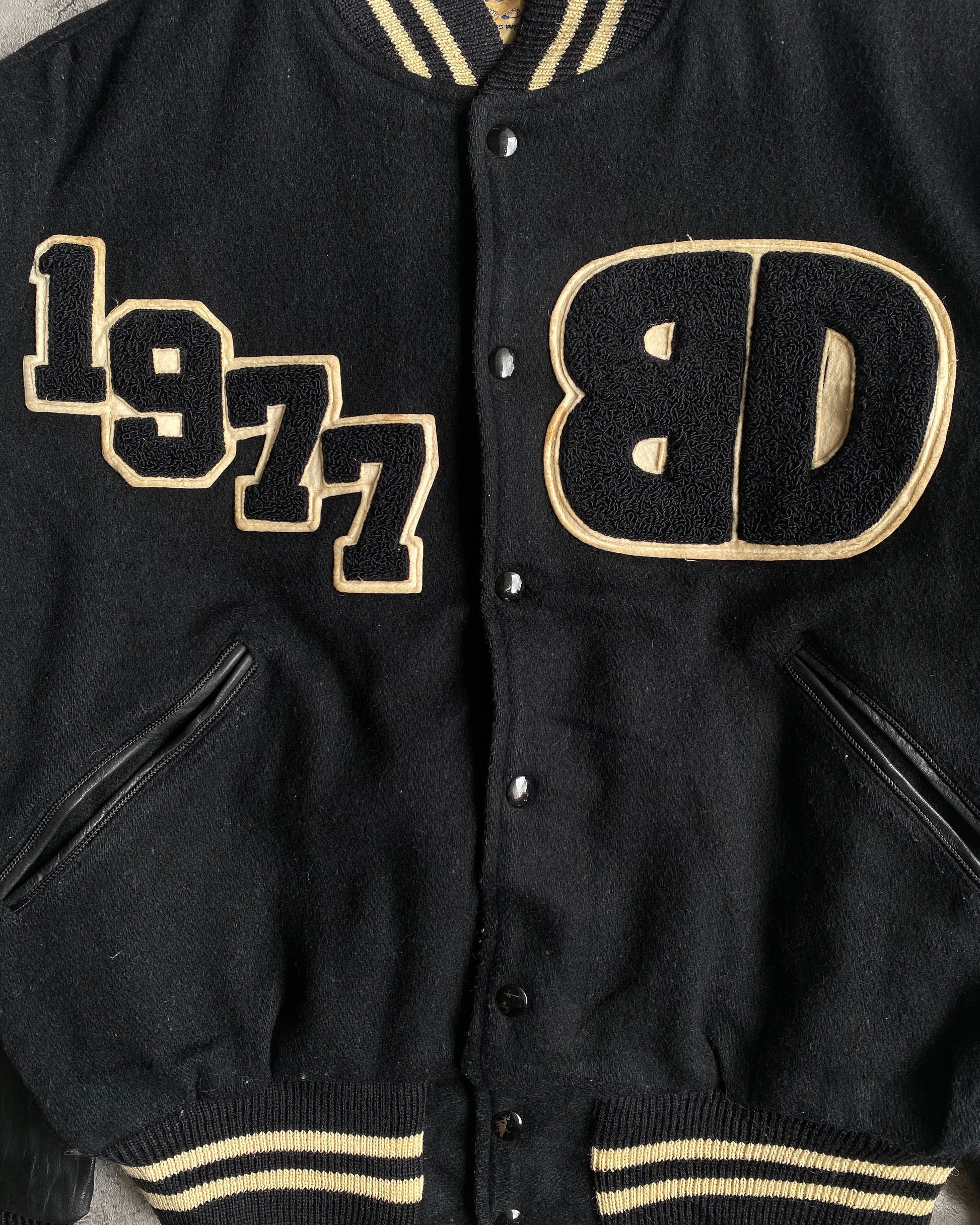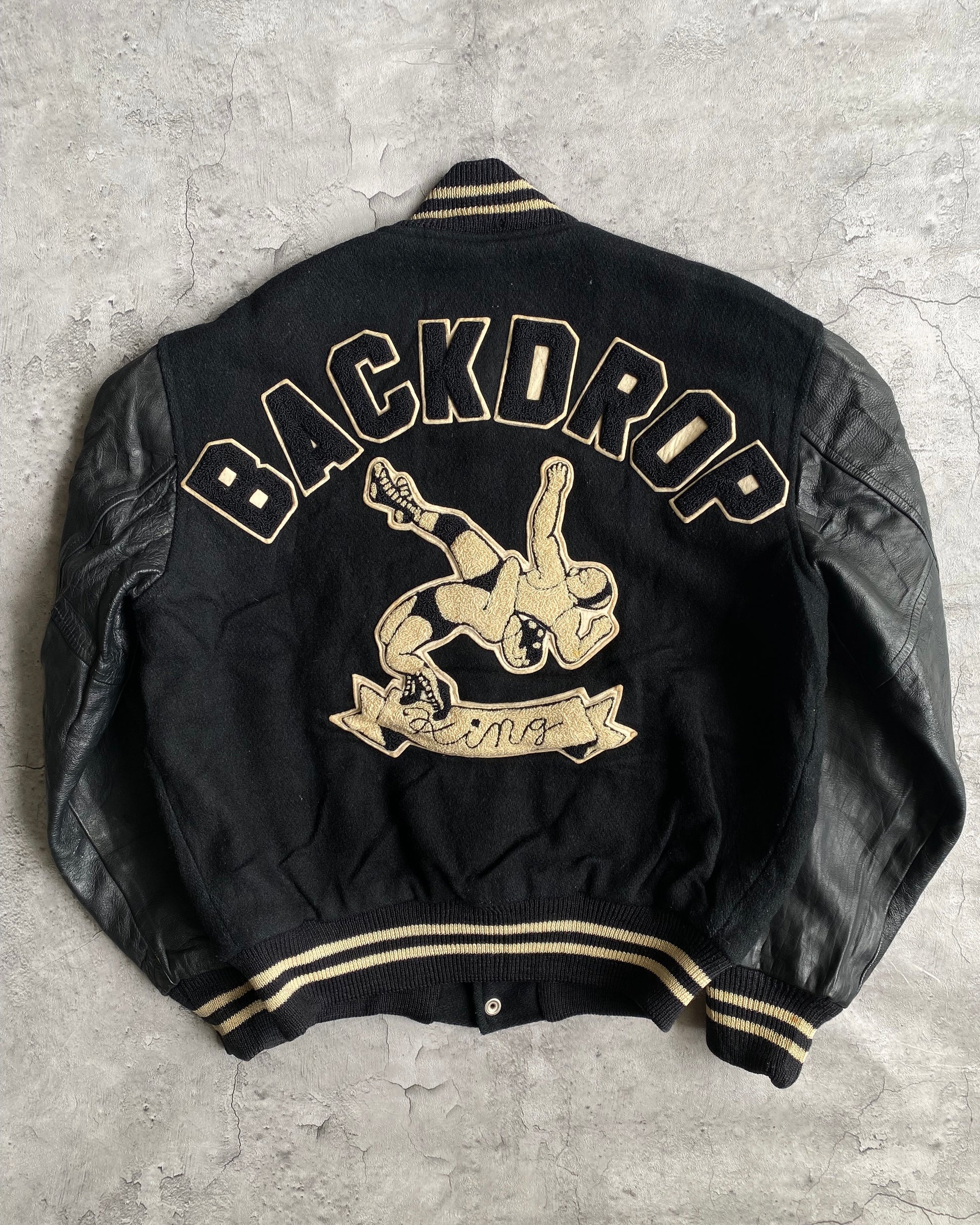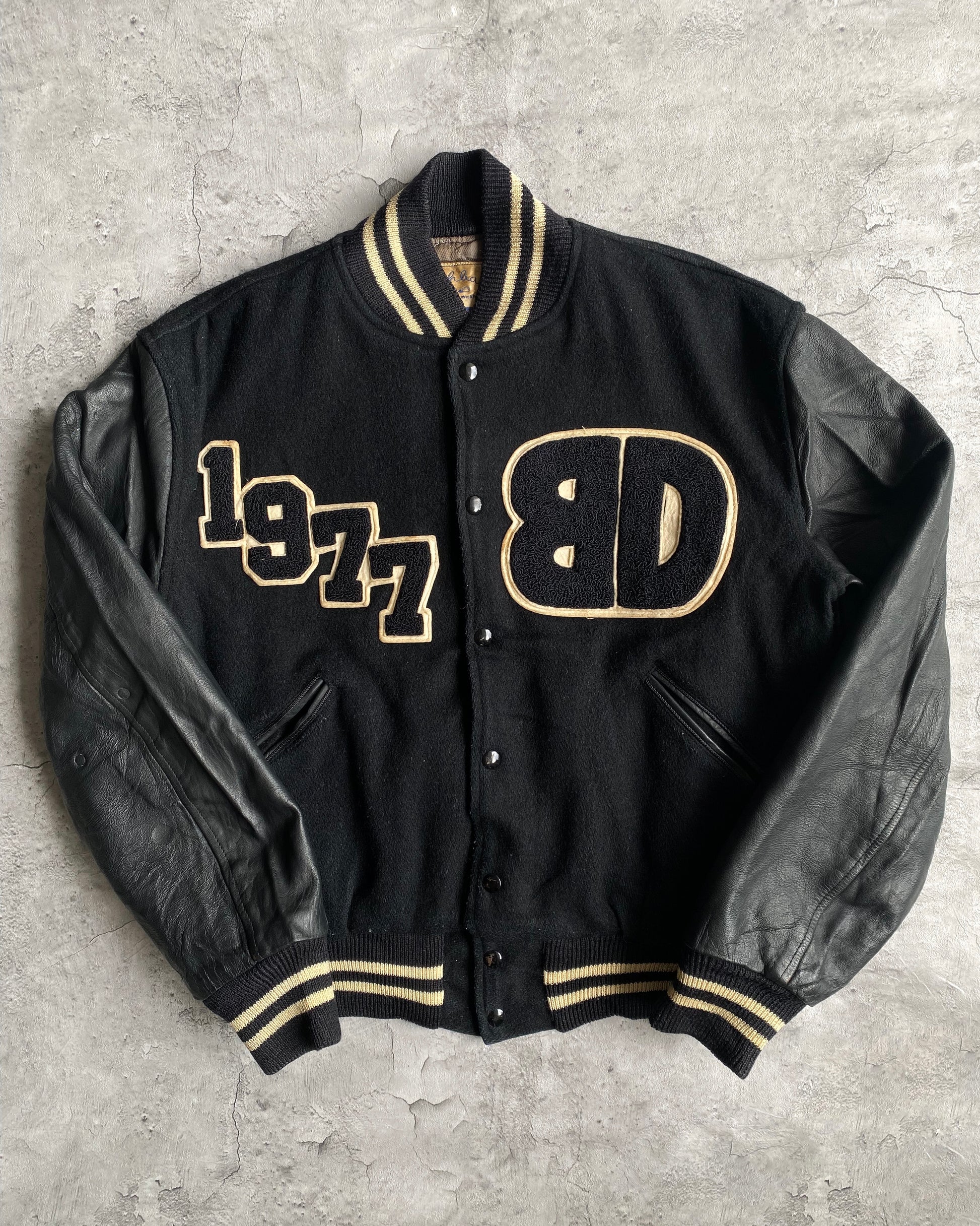 1977 'BACKDROP KING' LEATHER SLEEVES VARSITY JACKET (M/L)